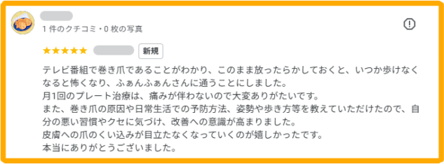 テレビ番組で巻き爪であることがわかり、このまま放ったらかしておくと、いつか歩けなくなると怖くなり、ふぁんふぁんさんに通うことにしました。