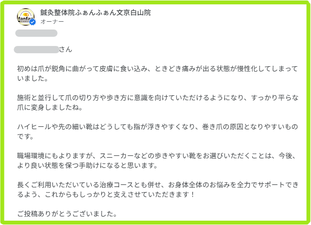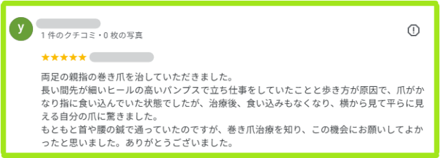 もともと首や腰の鍼で通っていたのですが、巻き爪治療を知り、この機会にお願いしてよかったと思いました。