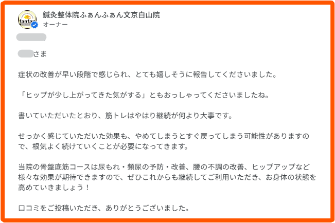 当院の骨盤底筋コースは尿もれ・頻尿の予防・改善、腰の不調の改善、ヒップアップなど様々な効果が期待できますので、ぜひこれからも継続してご利用いただき、お身体の状態を高めていきましょう!