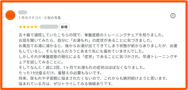 五十肩で通院していたこちらの院で、骨盤底筋のトレーニングチェアを知りました。