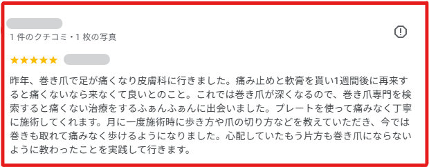 月に一度施術時に歩き方や爪の切り方などを教えていただき、今では巻きも取れて痛みなく歩けるようになりました。