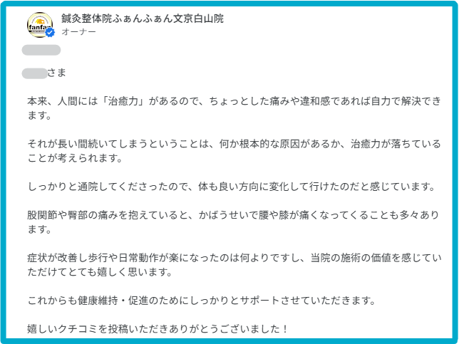 症状が改善し歩行や日常動作が楽になったのは何よりですし、当院の施術の価値を感じていただけてとても嬉しく思います。