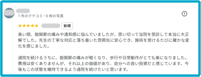 長い間、股関節の痛みや違和感に悩んでいましたが、思い切って当院を受診して本当に大正解でした。